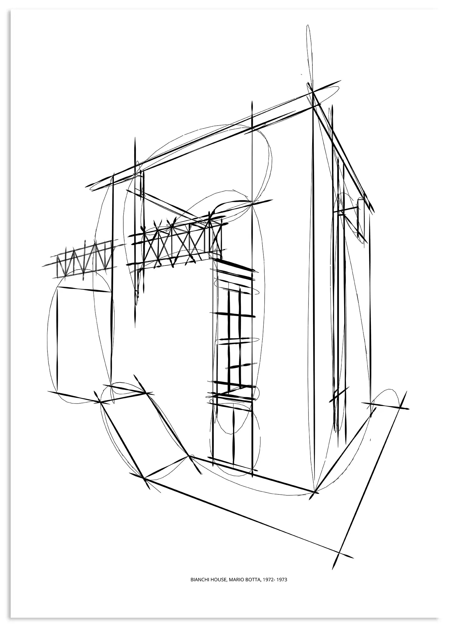 Immerse yourself in the striking simplicity of the iconic Bianchi House with this captivating architectural sketch. Designed by the renowned Mario Botta in 1972-1973, this modernist masterpiece is beautifully captured in a minimalist line art style, highlighting its distinctive geometric forms and structural elegance. Perfect for enthusiasts of contemporary architecture, design, and sophisticated aesthetics, this art print adds an intellectual and stylish touch to any space.