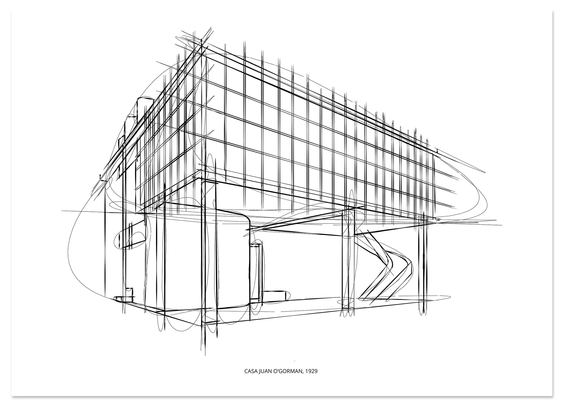 With sweeping lines and geometric precision, the "Casa Juan O'Gorman" Signature Sketch embodies the bold ingenuity of modernist architecture. A hallmark of Freezketch’s unique style, this piece captures the interplay of structure and fluidity that defined O'Gorman's 1929 masterpiece. Minimalist yet expressive, it pays homage to a visionary era where architecture merged with artistry, creating a timeless design for connoisseurs of innovation and elegance.