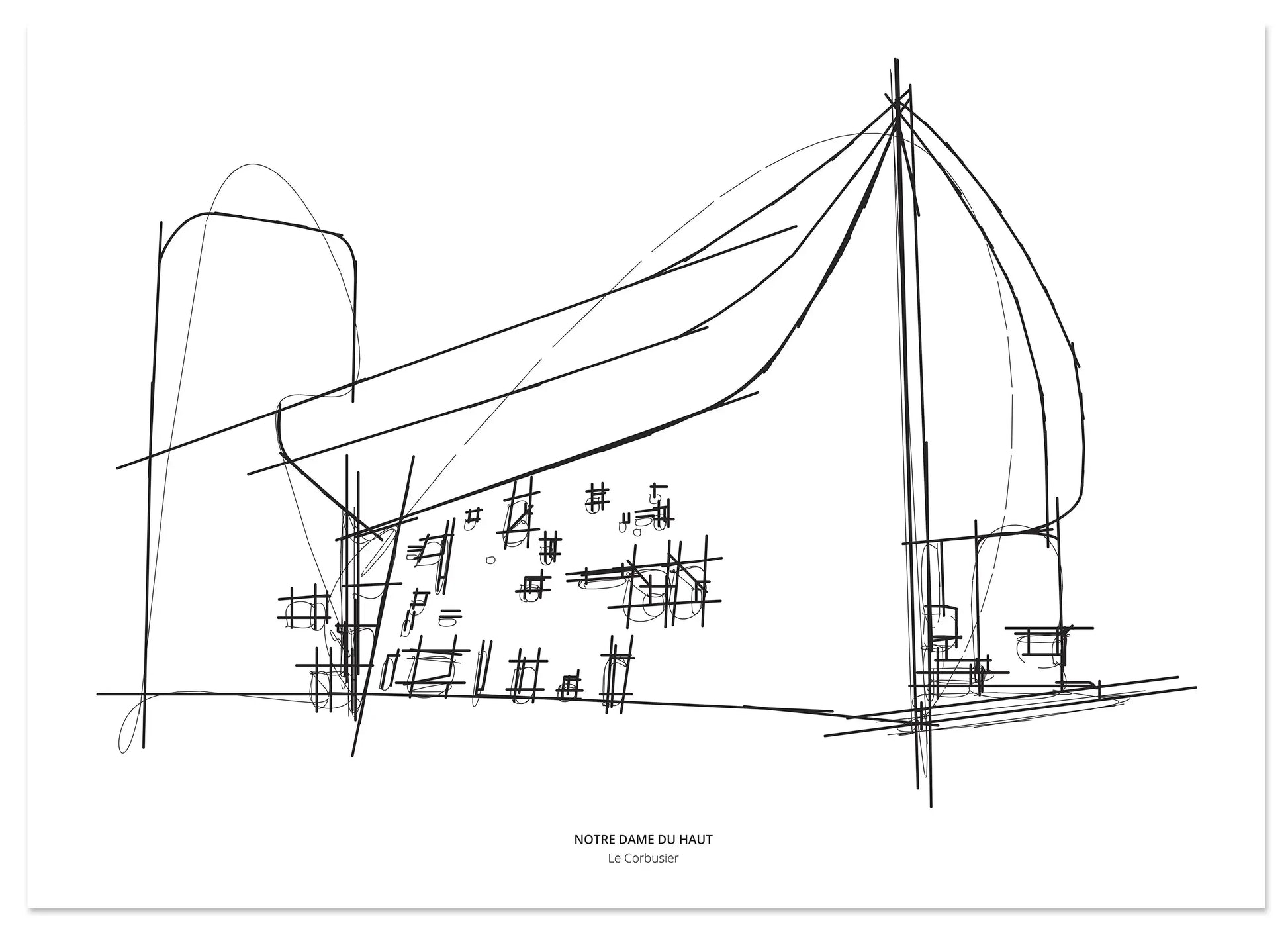 Immerse yourself in the iconic curves of Le Corbusier's masterpiece with this striking Notre Dame Du Haut architectural sketch print. This minimalist line art captures the abstract beauty and spiritual essence of Ronchamp Chapel, making it a sophisticated addition to any modern interior. A perfect blend of art and architecture, this print celebrates one of the 20th century's most influential designs, offering a timeless aesthetic for your space.