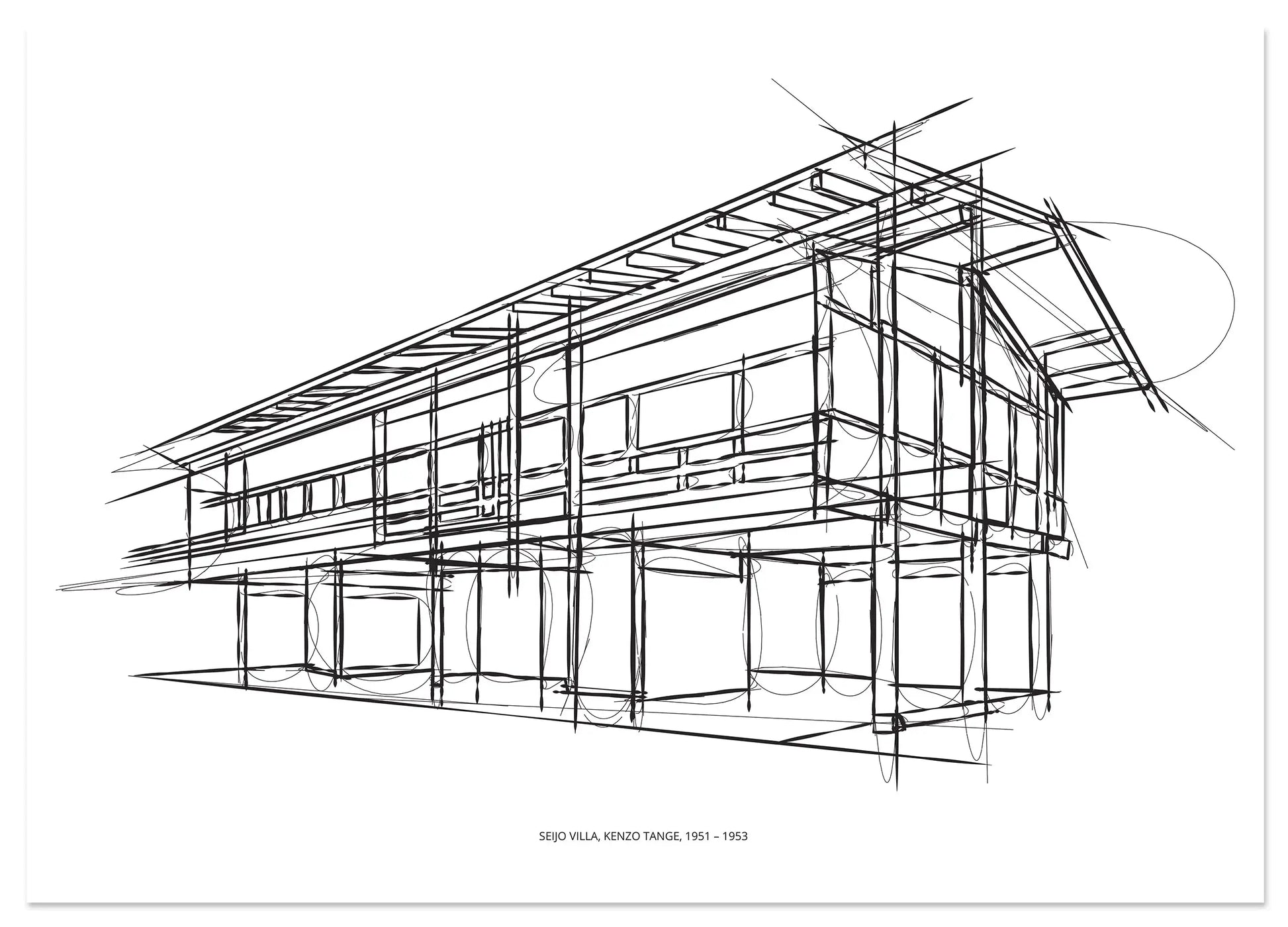 Step into the timeless elegance of Kenzo Tange's iconic Seijo Villa (1951-1953) with this exquisite architectural sketch print. This minimalist line art captures the structural genius and serene beauty of one of Japan's most celebrated mid-century modernist homes. Perfect for those who appreciate clean lines, historical design, and sophisticated aesthetics, this piece transforms any space into a gallery of architectural inspiration.