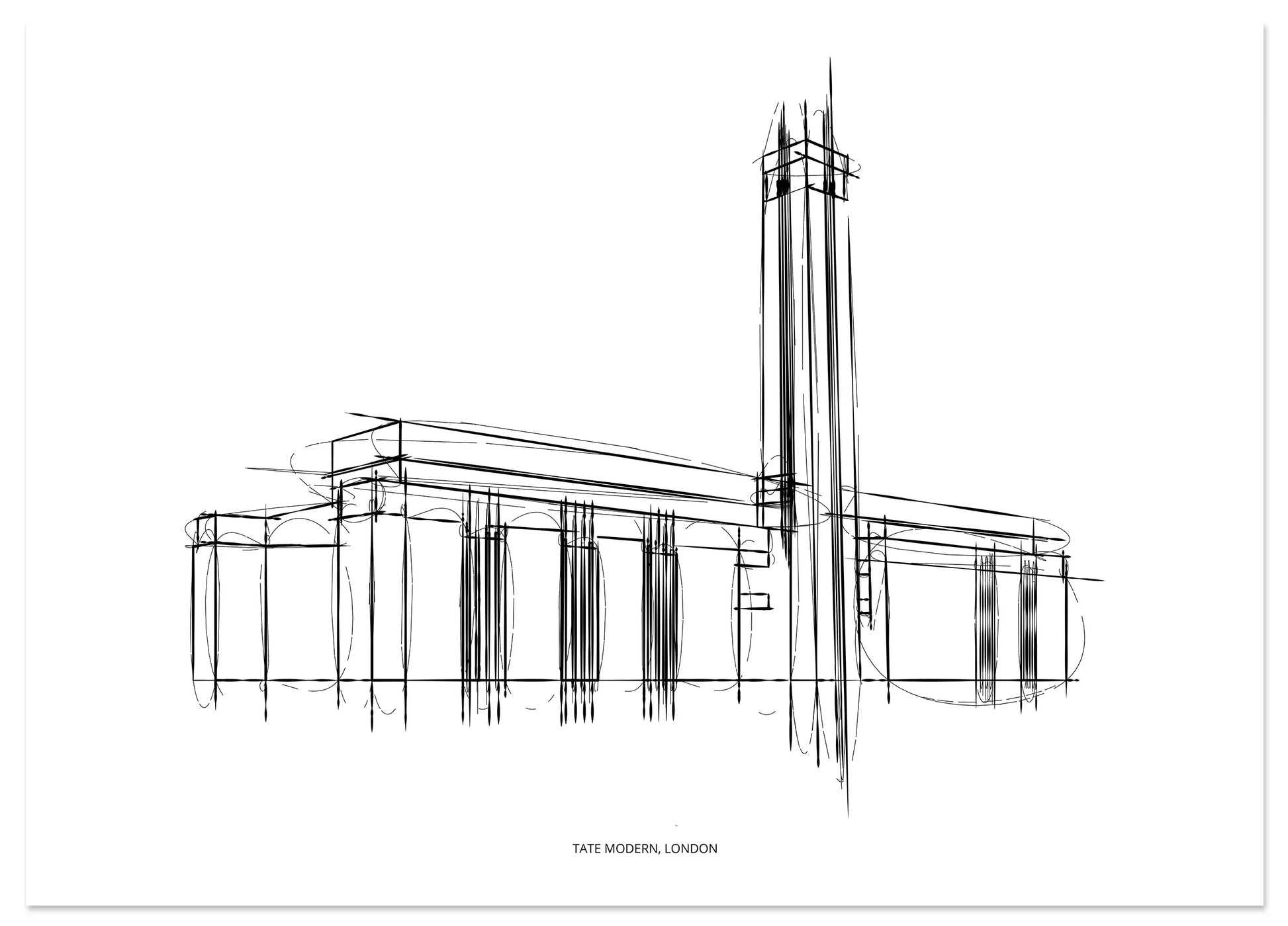 Capture the iconic spirit of London's Tate Modern with this striking architectural sketch print. This minimalist line art celebrates the brutalist beauty of the former power station, transformed into a world-renowned contemporary art gallery. Perfect for urban explorers, architecture enthusiasts, and those who cherish London's vibrant cultural scene, this piece brings sophisticated modern design to any space. This unique building portrait offers a fresh perspective on a beloved cityscape landmark, making it a compelling addition to your wall decor.
