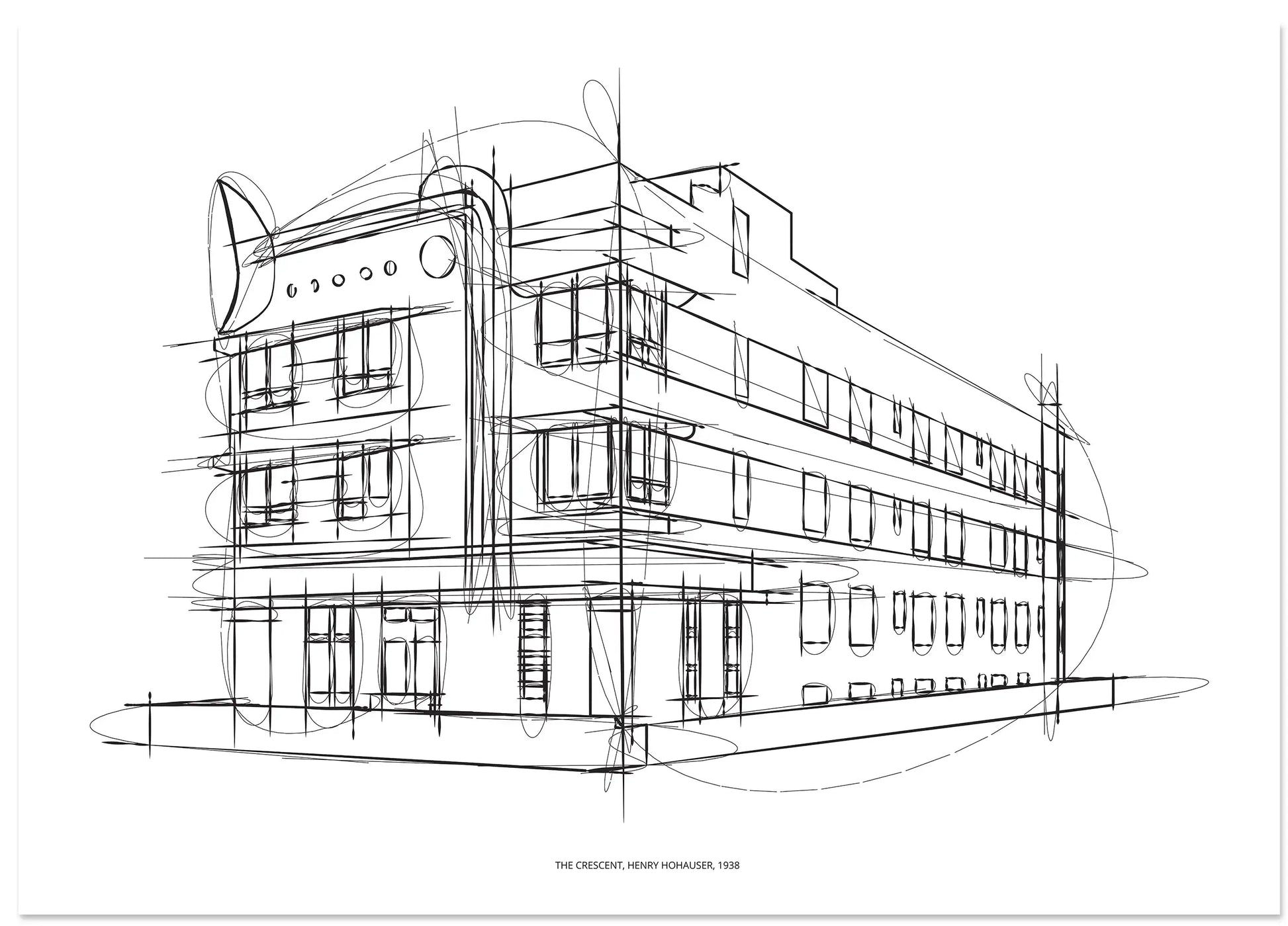 Step into the timeless elegance of architectural design with this captivating line art sketch of "The Crescent" by Henry Hohouser, 1938. This print beautifully captures the preliminary vision of a landmark structure, rendered with a dynamic, minimalist hand-drawn style. Perfect for those who appreciate the beauty of raw architectural expression and historical design, this artwork brings a sophisticated, urban touch to any space.