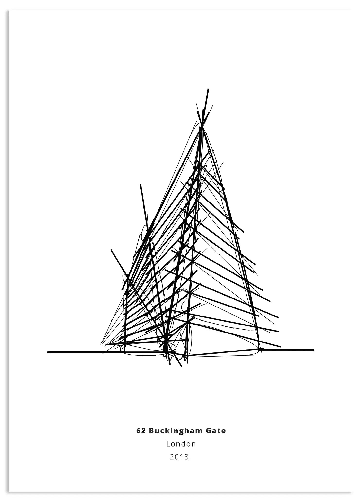 Capture the essence of London's iconic architecture with this striking minimalist art print of 62 Buckingham Gate. This intricate line art piece transforms a renowned landmark into a sophisticated, abstract sketch, perfect for those who appreciate modern design and urban elegance. Its geometric forms and clean lines offer a unique perspective, making it a captivating focal point in any contemporary space or a thoughtful gift for an architecture enthusiast.